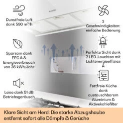 Smart, stimmungsvoll und elegant: Das ist die Klarstein Alina 90 Smart Dunstabzugshaube. Dabei überzeugt sie nicht nur durch ihr cleveres und stimmiges Design als Kopffreihaube, durch ihre integrierte WiFi-Schnittstelle kannst du die Alina ganz bequem mit deinem Smartphone steuern. Mit drei Geschwindigkeitsstufen, 594 m³/h Abluftleistung und verstecktem Fettfilter befreit sie zuverlässig deine Küche von Dampf und Brodel. Für ein Highlight der besonderen Art sorgt die zuschaltbare Ambiente-Beleuchtung mit neun unterschiedlichen Farben. Das unterseitige LED-Kochflächenlicht leuchtet das Kochgeschehen wunderbar aus und erfreut Topfgucker. Das zusätzliche frontseitige Touch-Bedienfeld fügt sich ideal in die edle Glasoberfläche ein und unterstreicht den modernen Look der Klarstein Alina 90 Smart Wandhaube.