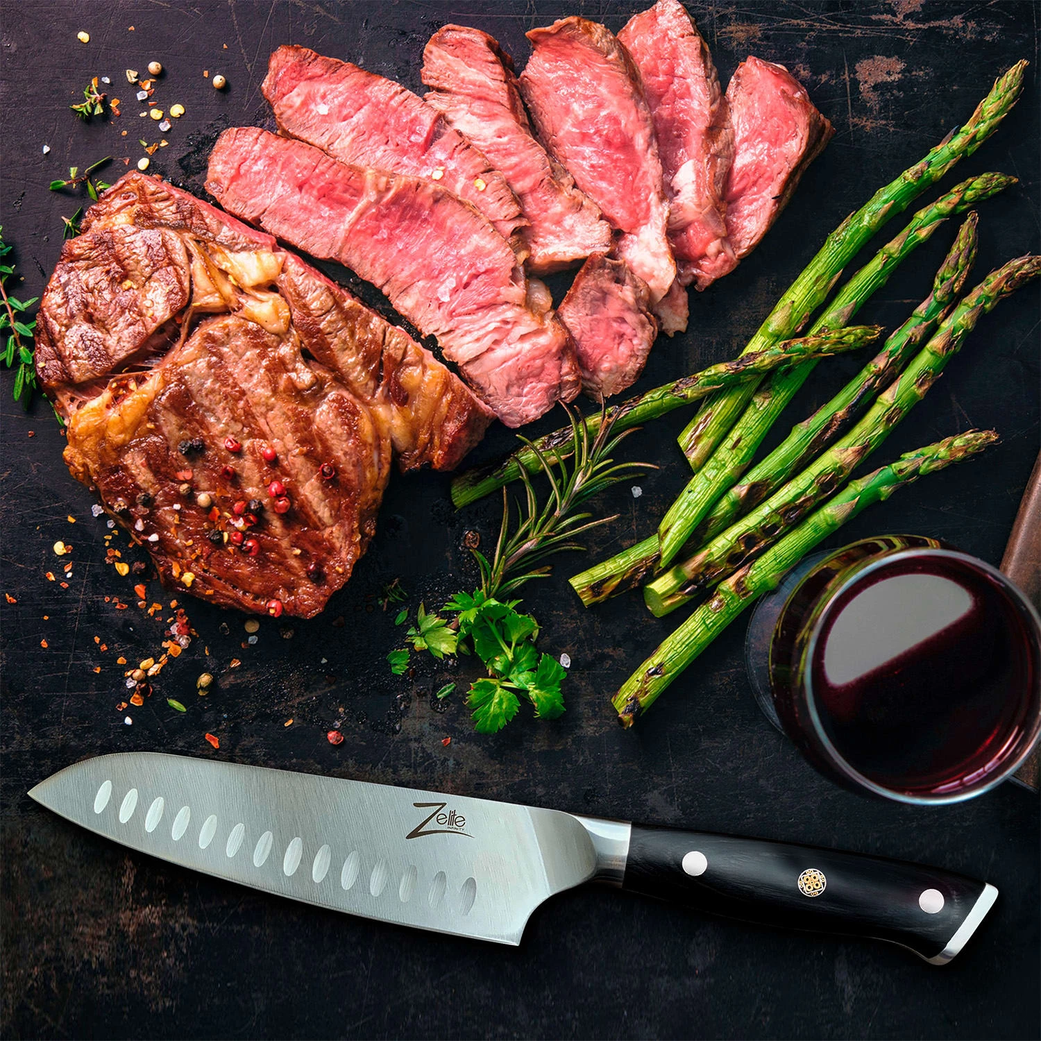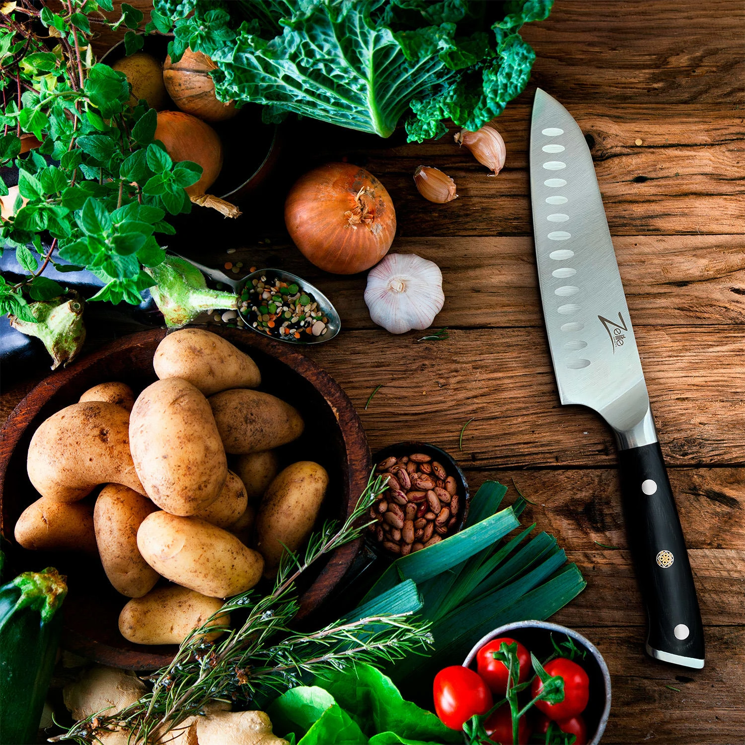 Das 7″ Santokumesser ist aus deutschem Qualitäts-Edelstahl von Thyssenkrupp und schwarzem Pakkaholz gefertigt. Der ergonomische, dreifach vernietete Griff ist mit einer Mosaikniete versehen und liegt beim Schneiden gut und sicher in der Hand. Das ursprünglich in Japan beheimatete Santokumesser hat sich zwischenzeitlich auch in der internationalen Küche gut bewährt. Das Küchenmesser eignet sich wunderbar für die Zubereitung von Wok-Gerichten oder Sushi. Überall, wo ein feiner Schnitt von Fleisch, Fisch, Gemüse und Kräutern gewünscht ist, ist das 7″ Santokumesser die perfekte Wahl.