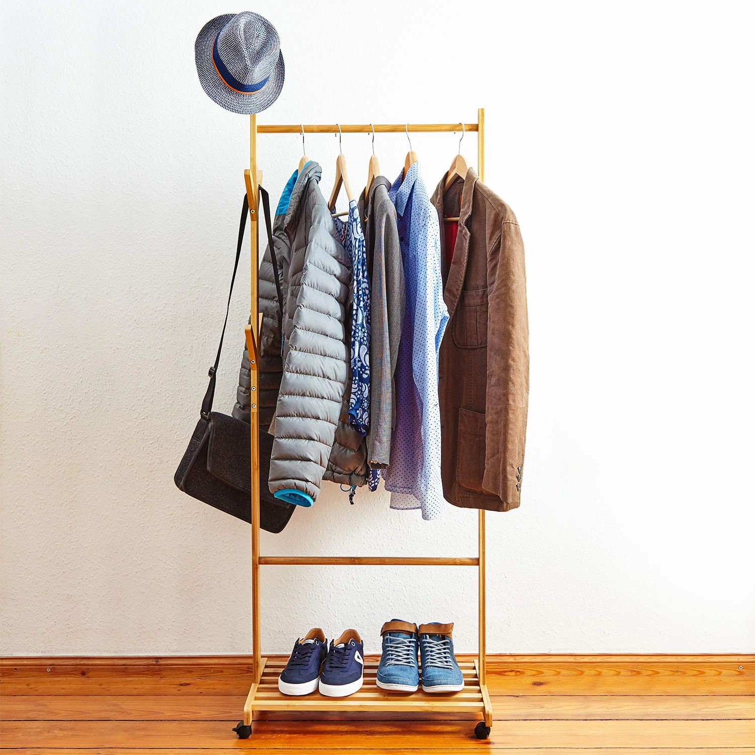 Zum besonderen Hingucker wird er durch die 6 Kleiderhaken mit einer jeweiligen Länge von 11,5 cm. Perfekt für eine elegante Hutgalerie, aber auch Jacken, Taschen, Mützen, Tücher und andere Utensilien können hier ihren Platz finden. Das macht optisch einiges her und ermöglicht dir maximalen Komfort: Alles ist gut verstaut und schnell griffbereit. Dabei bietet die untere Ablage Platz für 2 bis 3 Paar Schuhe. Blusen, Sakkos, Kleider und Jacken kannst du perfekt mit Bügeln an der oberen Kleiderstange aufbewahren.