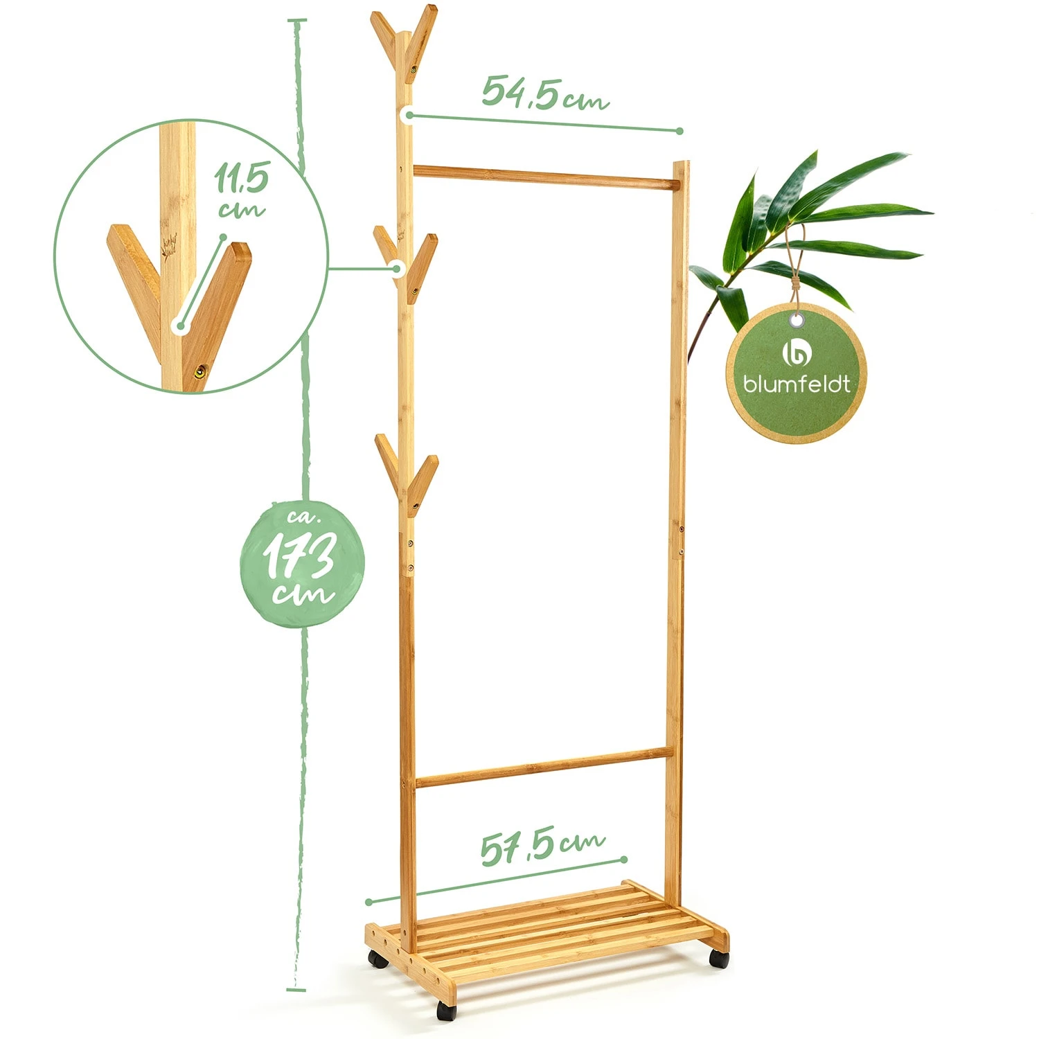Schlicht und elegant zugleich: Die fahrbare Garderobe von blumfeldt überzeugt als komfortable Kleideraufbewahrung und bildet zeitgleich eine schöne Kulisse in deinem Wohnraum. Die Kombination aus Bambus und der palmenähnlichen Form bringt exotischen Flair in dein Zuhause.