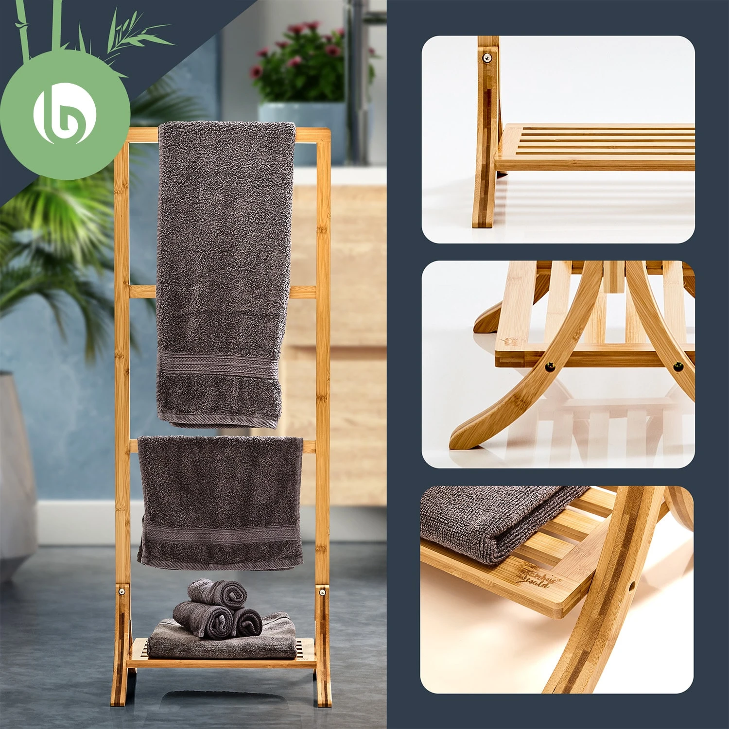 Wer kennt das nicht? Das Handtuch ist im Weg, denn es hängt über Badewannenrand oder Duschkabine. Es stört auf der Heizung oder kann nicht richtig trocknen, da es platzsparend aufgehängt werden muss. Damit ist nun Schluss, denn dank dem blumfeldt Handtuchständer kannst du deine Handtücher perfekt ausbreiten und trocknen. Dazu ist der Handtuchhalter eine pure Augenweide: kantig konstruiert und aus echtem Bambus hergestellt wirkt er wie ein Designerstück fürs Badezimmer. Besonders schön sind dabei die lebendig geschwungenen Füße, welche dem Ständer einen sicheren Stand verschaffen. Optisch setzen sie einen interessanten Kontrast zur Geradlinigkeit des Wäscheständers.