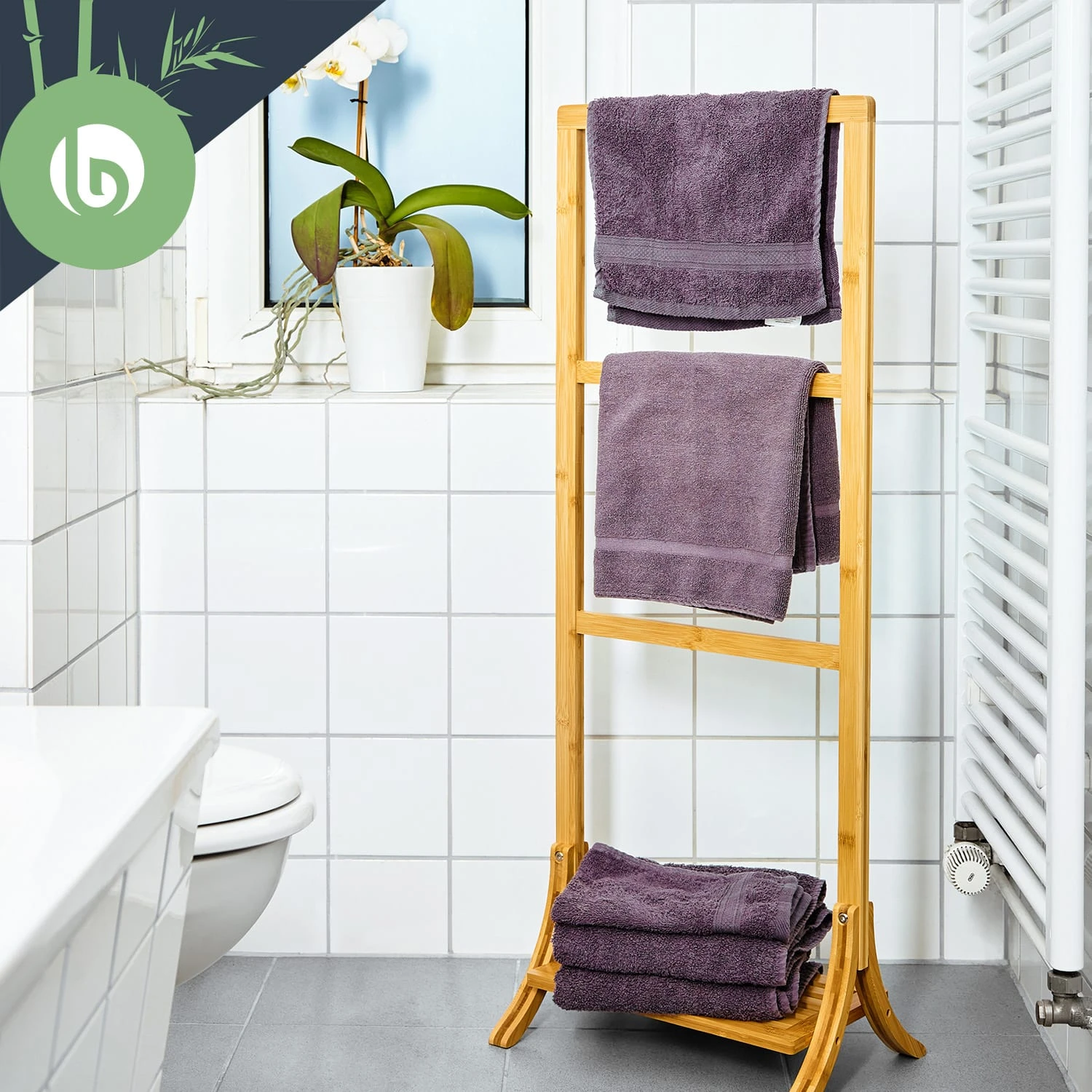 Das Besondere: die einzigartige Optik im Leiterdesgin! 3 unterschiedliche Handtuchstangen fügen sich hier akkurat zu einem Handtuchständer zusammen, verbunden durch die seitlichen Streben. Hier ist ausreichend Platz für kleine und große Badetücher geboten. Du kannst sie ideal ausbreiten, wodurch sie schnell und faltenlos trocknen. Die unterschiedlichen Höhen der Sprossen sorgen auch für Komfort. Denn die aufgehängten Badetücher kannst du so komfortabel mit nur einem Griff erreichen. Derweil bietet dir die untere Ablagefläche praktischen Platz: für Badeschuhe oder weitere Badezimmer-Utensilien.