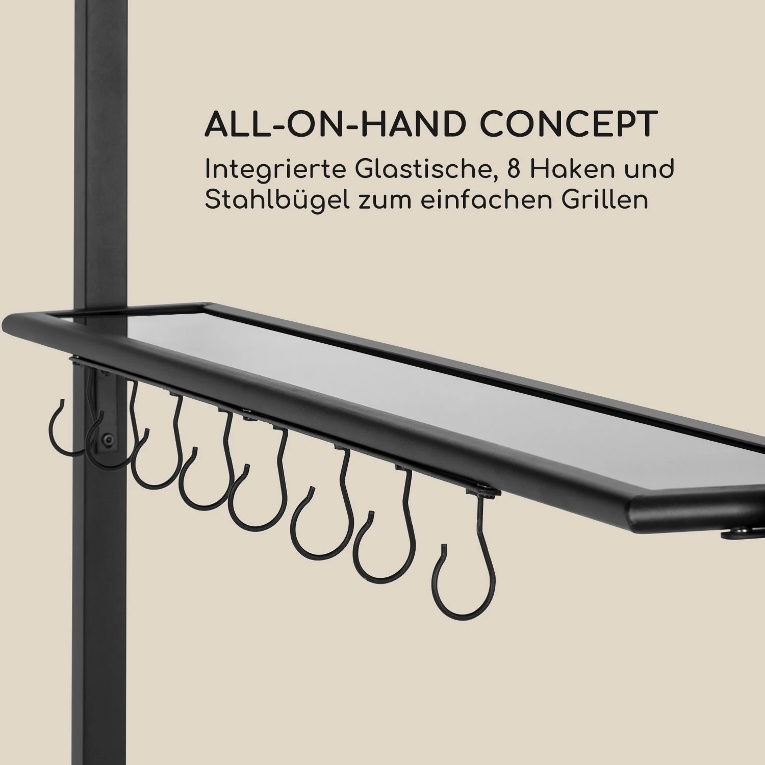 Diesen Sommer wird es heiß, denn das Blumfeldt Steakhouse Grill-Gazebo bringt Gartenparties auf ein neues Level. Vorbei sind die Zeiten des Jonglierens am Grill, denn das Grilldach folgt dem All-on-Hand Concept: Zwei große Ablageflächen aus schwarzem Glas bieten links und rechts dem Grillmeister jeweils 128 x 20 cm Ablageplatz für Schüsseln, Teller, Schalen, Saucen und natürlich Getränke. An 8 Stahlhaken finden Grillzange, Schürhaken, Pfannenwender, Handschuhe oder Topflappen übersichtliche Aufnahme und sind jederzeit erreichbar. Ein langer Stahlbügel an der Rückseite der Hütte kann zum Aufhängen von Handtüchern oder weiterem Grillwerkzeug genutzt werden.
