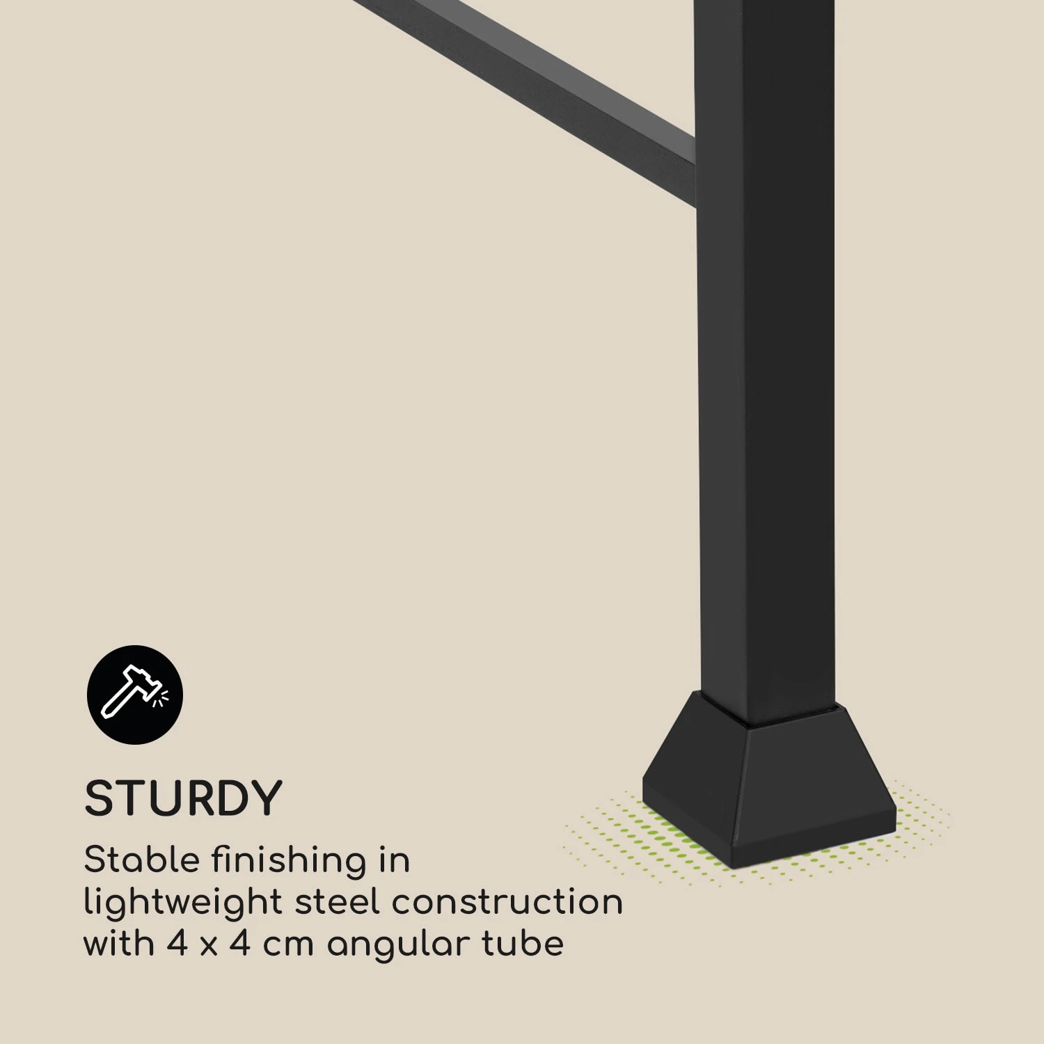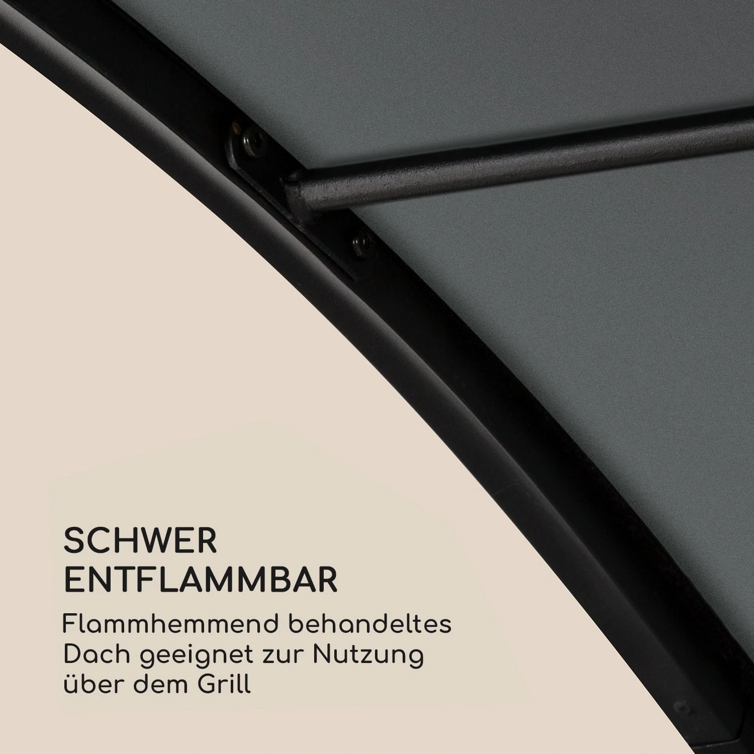 Grillen Sie, egal wie das Wetter wird! Das Dach der Blumfeldt Steakhouse Grillhütte schützt mit seinem 180 g/m² Polyesterdach perfekt vor zuviel Sonne und hält dank PU-Beschichtung auch Regen ab. Natürlich ist das Material flammhemmend behandelt, sodass der Grill gefahrlos unter dem Dach aufgestellt werden kann. Für Stabilität sorgt der pulverbeschichtete Rahmen aus Stahlkantrohr über dem sich das Dach aufwölbt. Für Standsicherheit wird das Steakhouse mit 8 Heringen zum Abspannen geliefert, es kann aber auch dank Bohrungen an den Füßen ganz einfach mit dem Terrassenboden verschraubt werden.